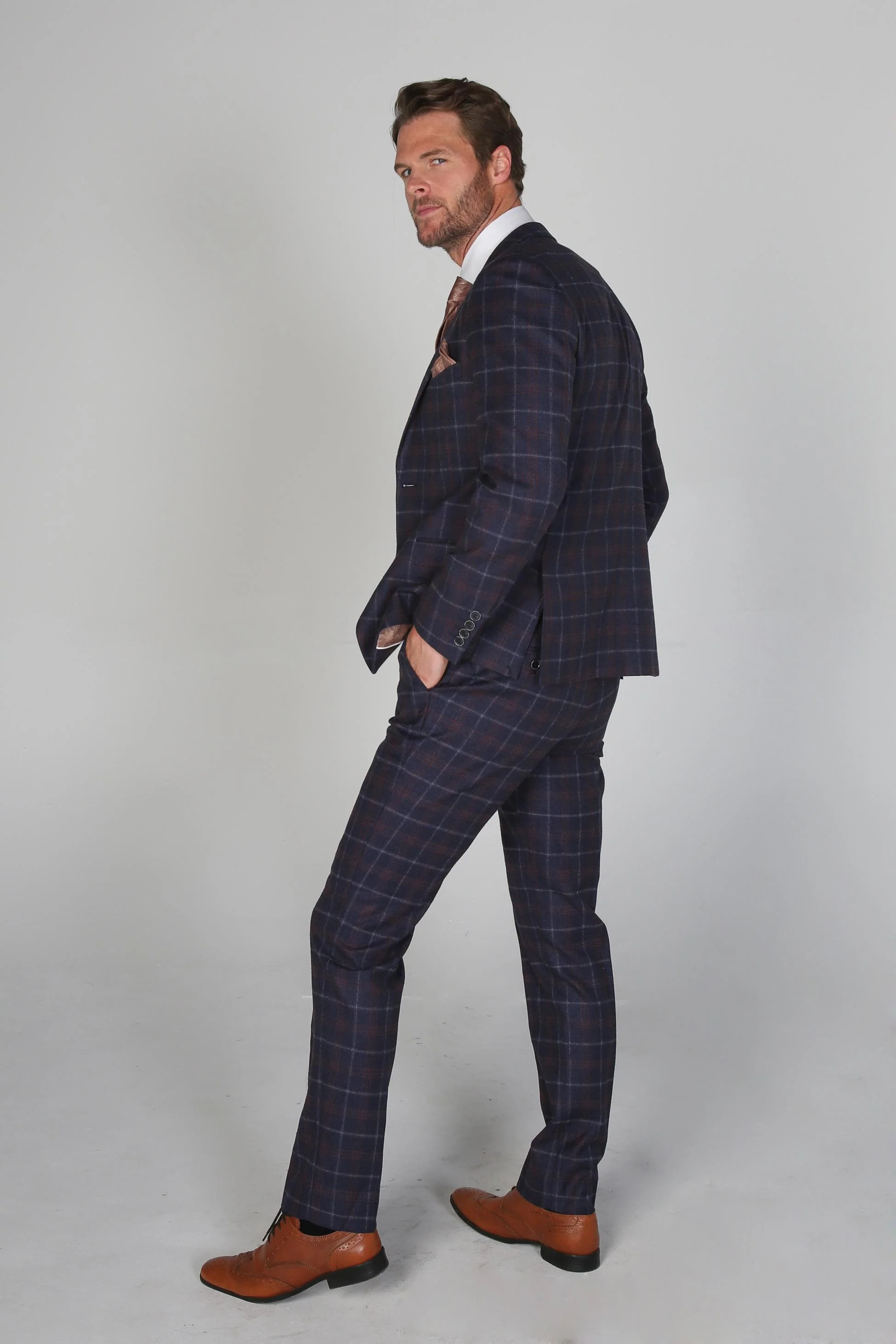 Men's Tailored Fit Retro Check Suit - KENNETH - Navy Blue - Maroon