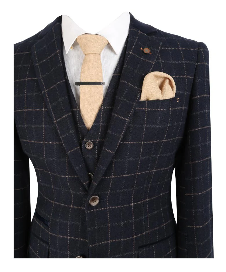 Men's Tweed Check Slim Fit Navy Suit- SHELBY - Navy Blue